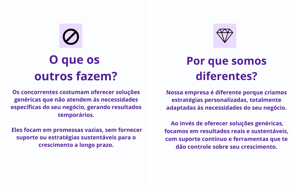 Oferecemos uma abordagem inovadora para o crescimento de vendas, desenvolvendo um sistema personalizado que se adapta às necessidades específicas da sua empresa. Ao contrário das soluções genéricas, nossa metodologia foca em estratégias comprovadas que garantem resultados consistentes e escaláveis.